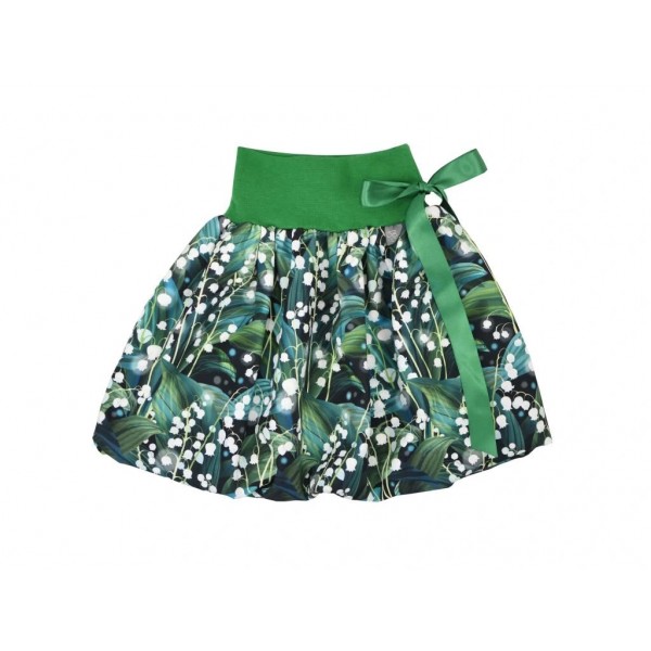 Dětská sukně balonového střihu s dvojitým elastickým pasovým okrajem. Podšité polyesterovou látkou. V pase je nechán otvor a jím protažená stuha, která pas stáhne.