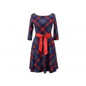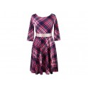 Dámské šaty s 3/4 rukávy a půlkolovou sukní. Jsou přestřižené v pase, lehce projmuté, s prodlouženým zadním dílem. Mají mírný lodičkový výstřih, v pase poutka na stuhu (můžou se lehce odstranit). Kapsy v bocích nesmí chybět... :) Materiál: 92% bavlna + 8% elastan - úplet s digitálním potiskem, pevnější - méně pruží Velikost: XL, délka zadního dílu...