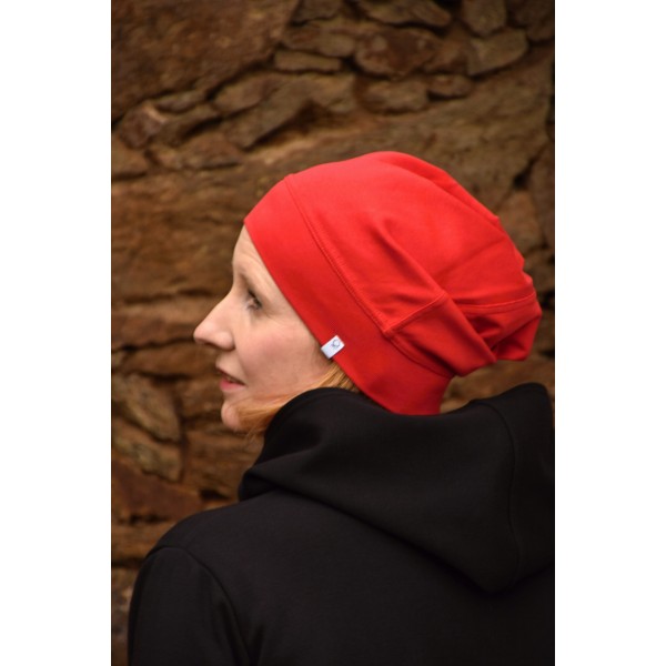 Čepice je zhotovena z bavlny-elastan. Je volnejšího střihu vzadu přepadlá.