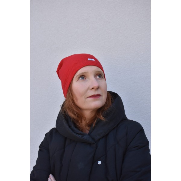 Čepice je zhotovena z bavlna/pes/elastan. Je volnějšího střihu mírně přepadlá. Ve předu ozdobena logem. Velikost je UNI.