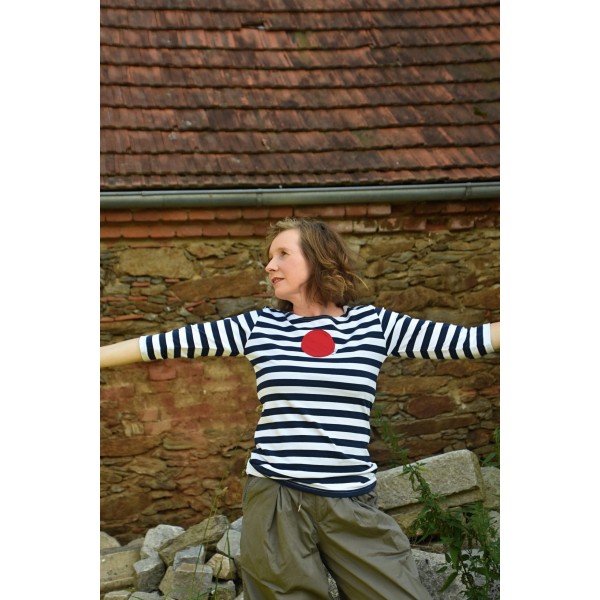 Jednoduché námořnické triko s 3/4 rukávem, zhotovené z bavlna/elastan. Triko má jednoduchý střih s lodičkovým výstřihem, dá se kombinovat s čímkoliv. Námořnické pruhování je veselé. Doporučené praní v pračce na 40°C. Na předním díle je našité červené kolo.