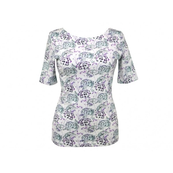 Dámské tričko z příjemného elastického úpletu. V pase projmuté, lodičkový výstřih. Rukávek je delší, ale stále nad loket. :)