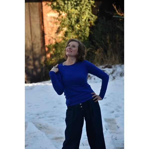 Jednoduché triko, viskoza/elastan/pes. Triko má má menší gramáž, hodí se skvěle i jako podvlékací triko. Průkrčník je lemovaný, rukáv dlouhý. Doporučené praní v pračce na 40°C.